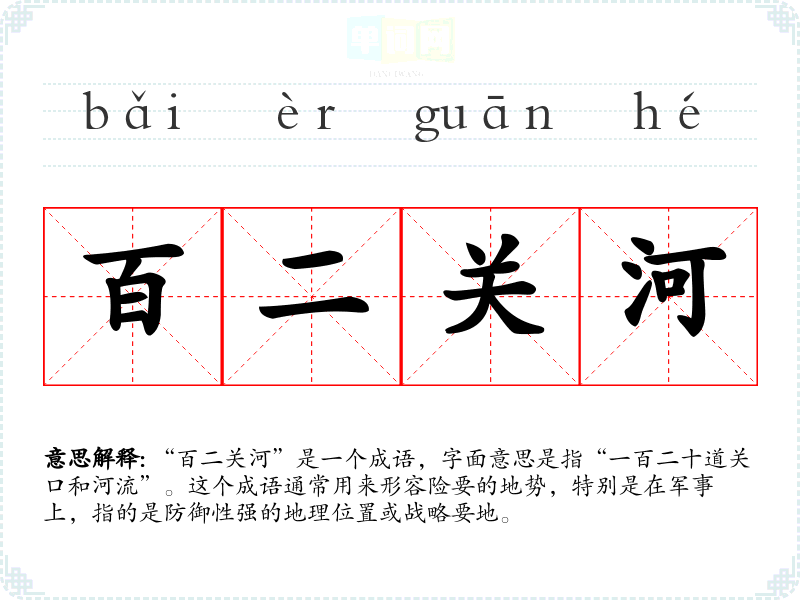 “百二关河”是一个成语,字面意思是指“一百二十道关口和河流”。这个成语通常用来形容险要的地势,特别是在军事上,指的是防御性强的地理位置或战略要地。