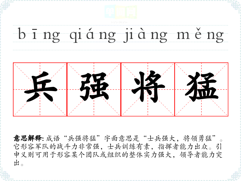 成语“兵强将猛”字面意思是“士兵强大,将领勇猛”。它形容军队的战斗力非常强,士兵训练有素,指挥者能力出众。引申义则可用于形容某个团队或组织的整体实力强大,领导者能力突出。