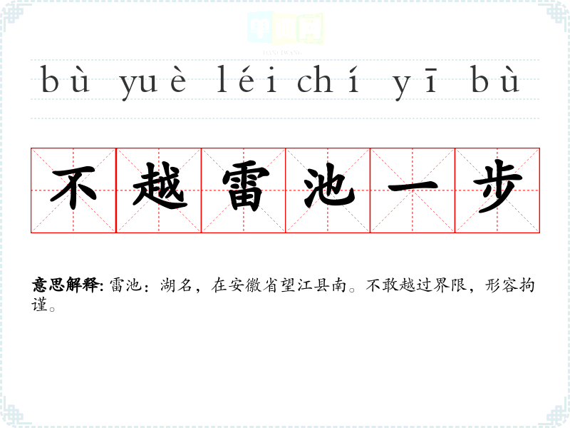 | 不敢越雷池一步 | 越:跨过;雷池:湖名,在安徽省望江县南。原指不要越过雷池。后比喻不敢超越一定的范围和界限。 |