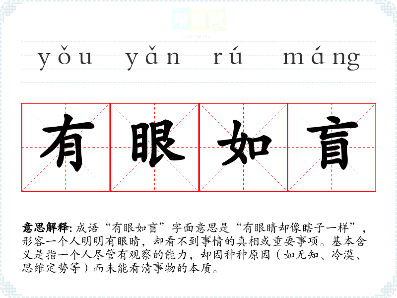 成语“有眼如盲”字面意思是“有眼睛却像瞎子一样”,形容一个人明明有眼睛,却看不到事情的真相或重要事项。基本含义是指一个人尽管有观察的能力,却因种种原因(如无知、冷漠、思维定势等)而未能看清事物的本质。