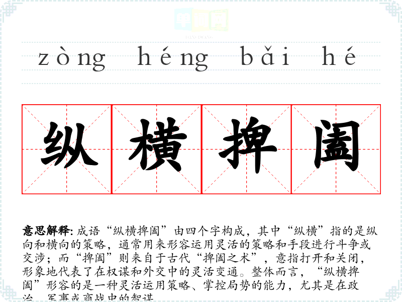 成语“纵横捭阖”由四个字构成,其中“纵横”指的是纵向和横向的策略,通常用来形容运用灵活的策略和手段进行斗争或交涉;而“捭阖”则来自于古代“捭阖之术”,意指打开和关闭,形象地代表了在权谋和外交中的灵活变通。整体而言,“纵横捭阖”形容的是一种灵活运用策略、掌控局势的能力,尤其是在政治、军事或商战中的智谋。