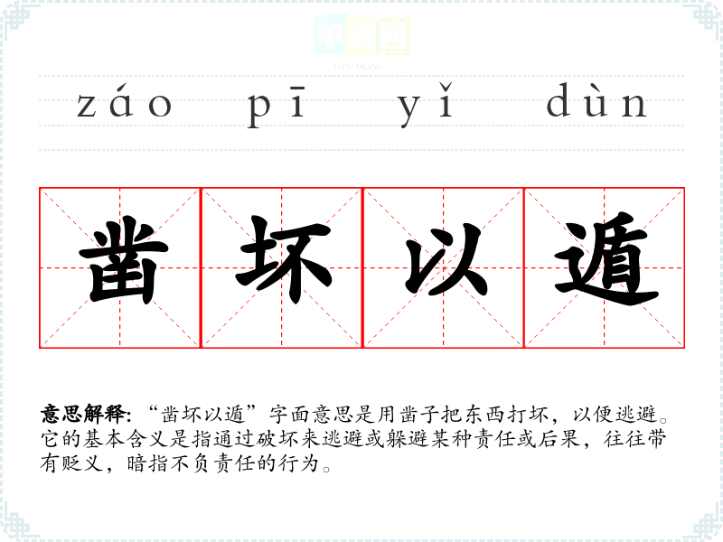 “凿坏以遁”字面意思是用凿子把东西打坏,以便逃避。它的基本含义是指通过破坏来逃避或躲避某种责任或后果,往往带有贬义,暗指不负责任的行为。