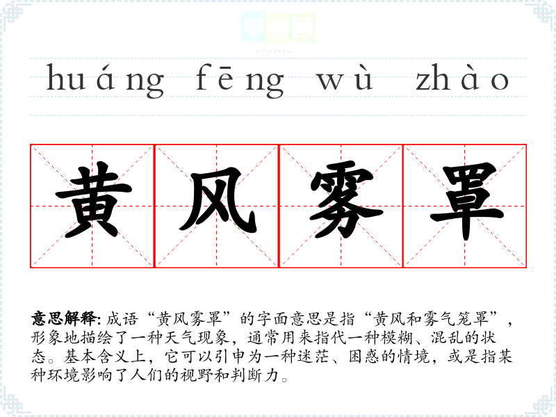 - 反义成语:如“豁然开朗”,意指状况明朗,视线清晰,与“黄风雾罩”形成鲜明对比。