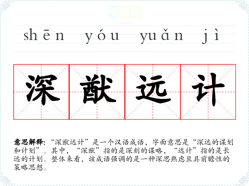 “深猷远计”是一个汉语成语,字面意思是“深远的谋划和计划”。其中,“深猷”指的是深刻的谋略,“远计”指的是长远的计划。整体来看,该成语强调的是一种深思熟虑且具前瞻性的策略思想。