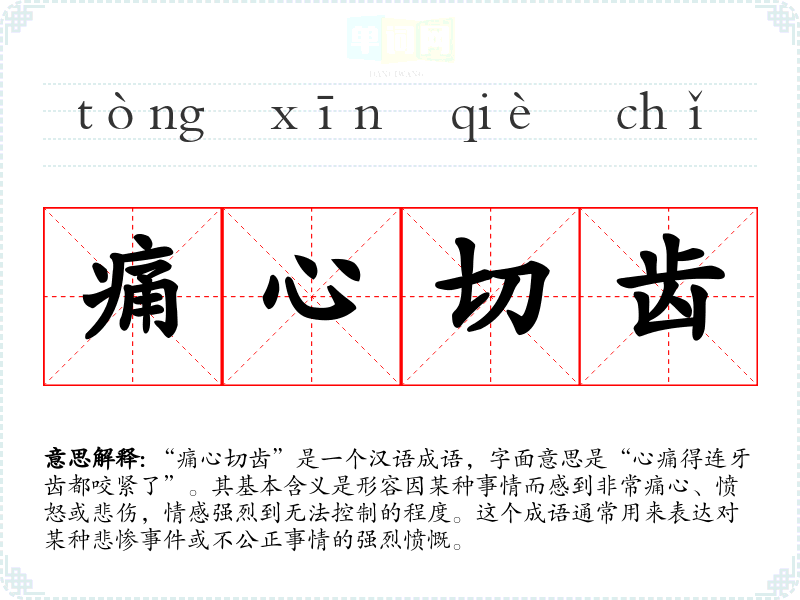 “痛心切齿”是一个汉语成语,字面意思是“心痛得连牙齿都咬紧了”。其基本含义是形容因某种事情而感到非常痛心、愤怒或悲伤,情感强烈到无法控制的程度。这个成语通常用来表达对某种悲惨**或不公正事情的强烈愤慨。