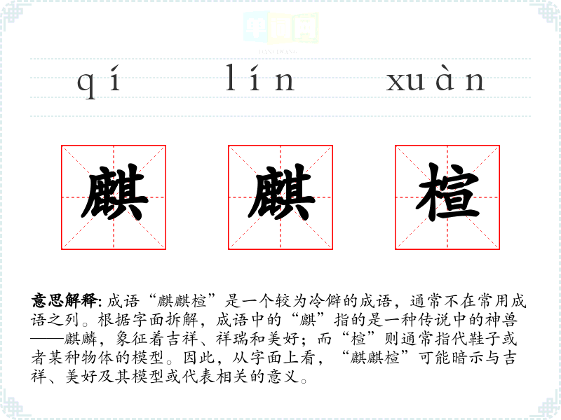 成语“麒麒楦”是一个较为冷僻的成语,通常不在常用成语之列。根据字面拆解,成语中的“麒”指的是一种传说中的神兽——麒麟,象征着吉祥、祥瑞和美好;而“楦”则通常指代鞋子或者某种物体的模型。因此,从字面上看,“麒麒楦”可能暗示与吉祥、美好及其模型或代表相关的意义。