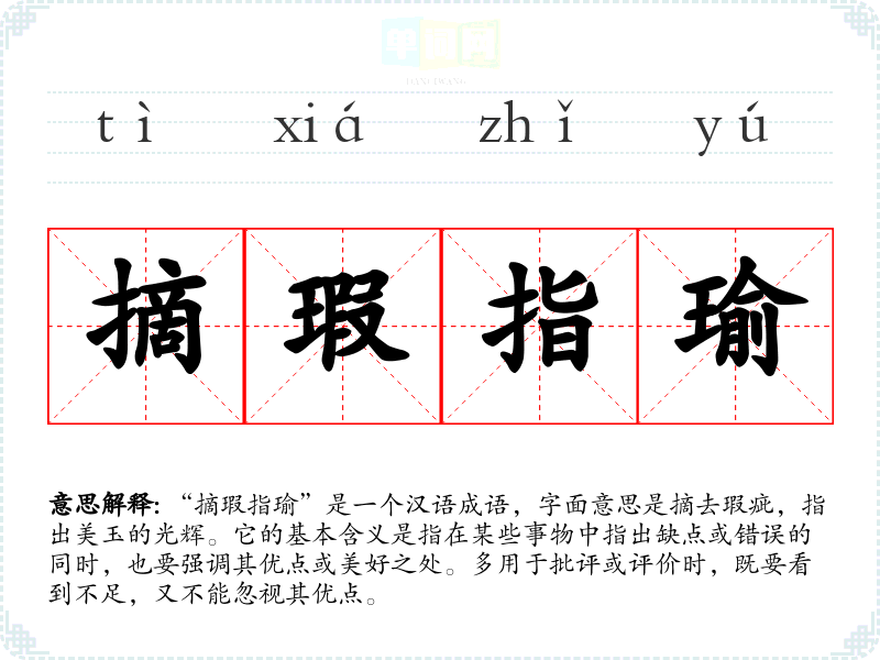 “摘瑕指瑜”是一个汉语成语,字面意思是摘去瑕疵,指出美玉的光辉。它的基本含义是指在某些事物中指出缺点或错误的同时,也要强调其优点或美好之处。多用于批评或评价时,既要看到不足,又不能忽视其优点。
