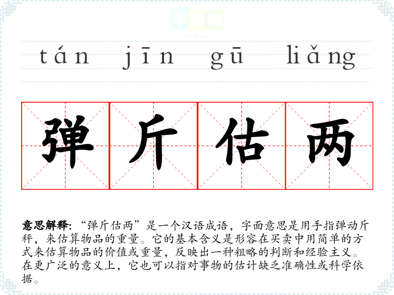 “弹斤估两”是一个汉语成语,字面意思是用手指弹动斤秤,来估算物品的重量。它的基本含义是形容在买卖中用简单的方式来估算物品的价值或重量,反映出一种粗略的判断和经验主义。在更广泛的意义上,它也可以指对事物的估计缺乏准确性或科学依据。