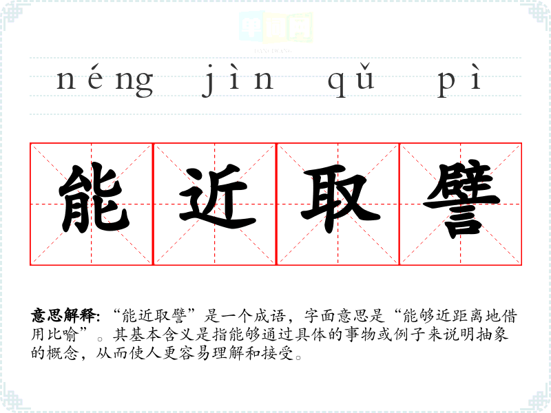 “能近取譬”是一个成语,字面意思是“能够近距离地借用比喻”。其基本含义是指能够通过具体的事物或例子来说明抽象的概念,从而使人更容易理解和接受。