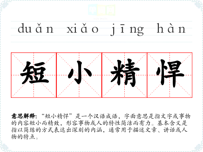 “短小精悍”是一个汉语成语,字面意思是指文字或事物的内容短小而精致,形容事物或人的特性简洁而有力。基本含义是指以简练的方式表达出深刻的内涵,通常用于描述文章、讲话或人物的特点。