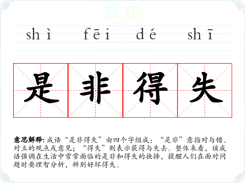 成语“是非得失”由四个字组成:“是非”意指对与错、对立的观点或意见;“得失”则表示获得与失去。整体来看,该成语强调在生活中常常面临的是非和得失的抉择,提醒人们在面对问题时要理智分析,辨别好坏得失。