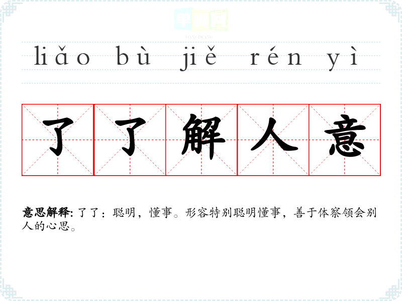 | 了了解人意 | 了了:聪明,懂事。形容特别聪明懂事,善于体察领会别人的心思。 |
