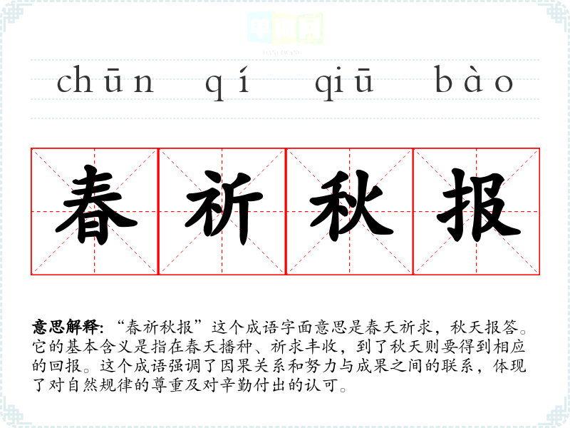 在**传统文化中,农业是基础,人与自然的和谐关系被高度重视。“春祈秋报”体现了这种文化背景,强调了自然规律和人们的努力。此外,这一成语在现代社会中仍然适用,适合用于各种需要付出和回报的场合,尤其是教育、工作和人际关系。