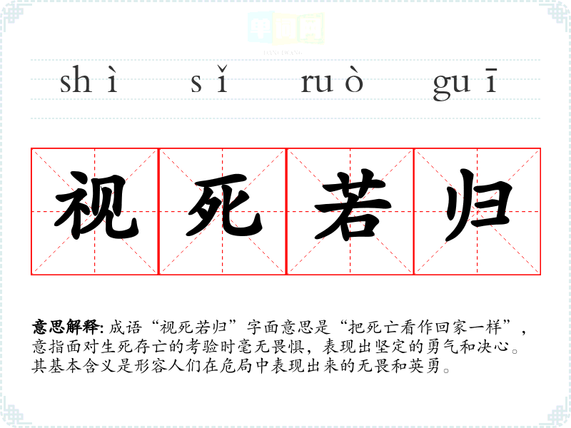 成语“视死若归”字面意思是“把死亡看作回家一样”,意指面对生死存亡的考验时毫无畏惧,表现出坚定的勇气和决心。其基本含义是形容人们在危局中表现出来的无畏和英勇。