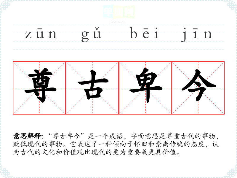 “尊古卑今”是一个成语,字面意思是尊重古代的事物,贬低现代的事物。它表达了一种倾向于怀旧和崇尚传统的态度,认为古代的文化和价值观比现代的更为重要或更具价值。