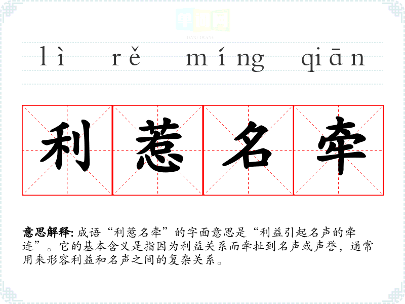 成语“利惹名牵”的字面意思是“利益引起名声的牵连”。它的基本含义是指因为利益关系而牵扯到名声或声誉,通常用来形容利益和名声之间的复杂关系。