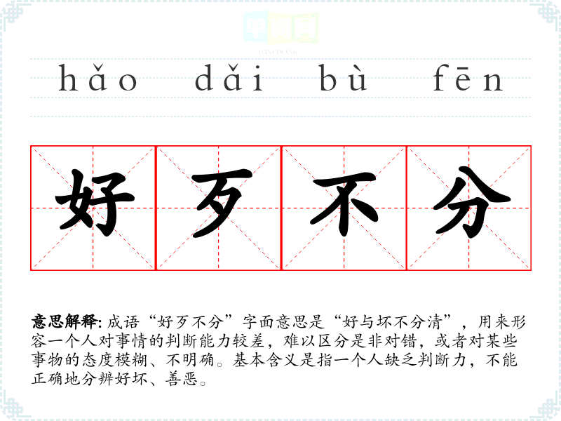 成语“好歹不分”字面意思是“好与坏不分清”,用来形容一个人对事情的判断能力较差,难以区分是非对错,或者对某些事物的态度模糊、不明确。基本含义是指一个人缺乏判断力,不能正确地分辨好坏、善恶。