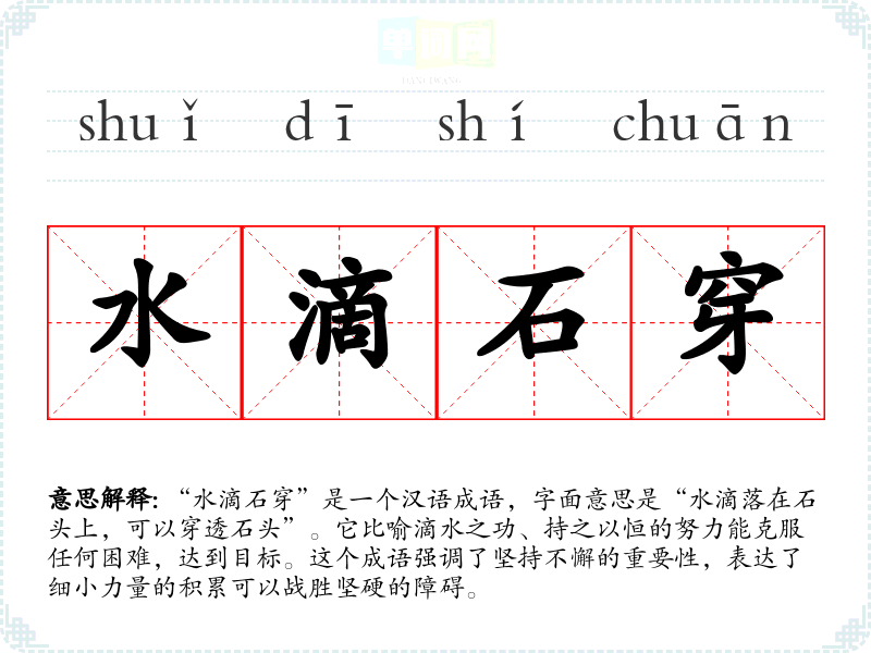 “水滴石穿”是一个汉语成语,字面意思是“水滴落在石头上,可以穿透石头”。它比喻滴水之功、持之以恒的努力能克服任何困难,达到目标。这个成语强调了坚持不懈的重要性,表达了细小力量的积累可以战胜坚硬的障碍。