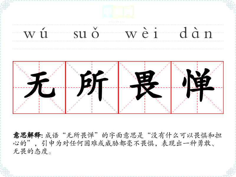 成语“无所畏惮”的字面意思是“没有什么可以畏惧和担心的”,引申为对任何困难或威胁都毫不畏惧,表现出一种勇敢、无畏的态度。