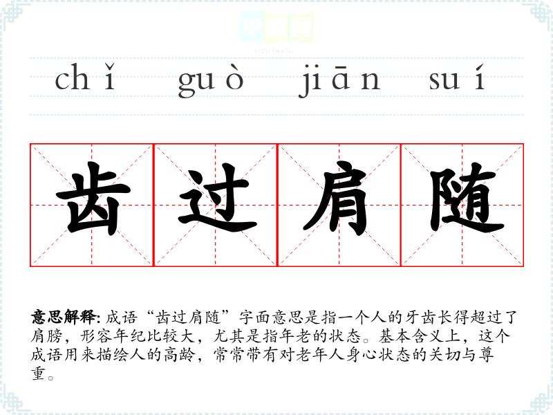 成语“齿过肩随”字面意思是指一个人的牙齿长得超过了肩膀,形容年纪比较大,尤其是指年老的状态。基本含义上,这个成语用来描绘人的高龄,常常带有对老年人身心状态的关切与尊重。