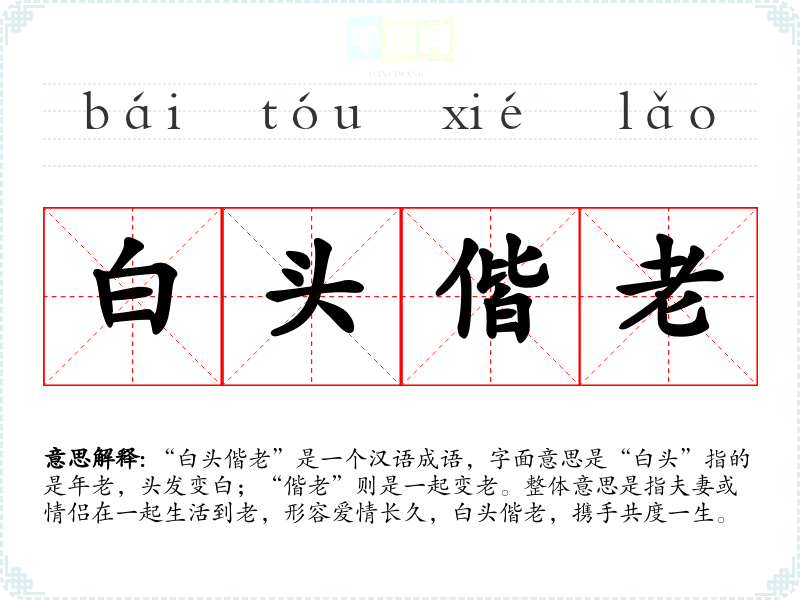 “白头偕老”是一个汉语成语,字面意思是“白头”指的是年老,头发变白;“偕老”则是一起变老。整体意思是指夫妻或情侣在一起生活到老,形容爱情长久,白头偕老,携手共度一生。