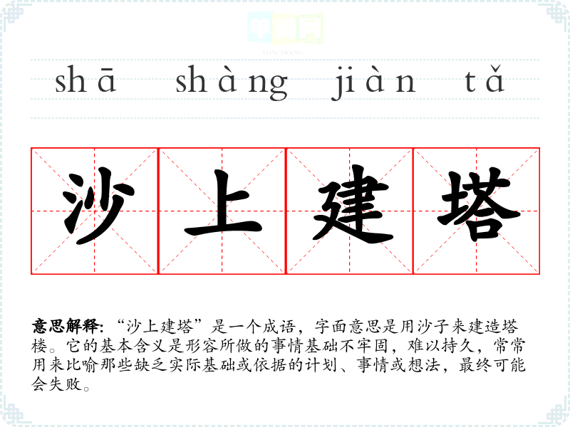 “沙上建塔”是一个成语,字面意思是用沙子来建造塔楼。它的基本含义是形容所做的事情基础不牢固,难以持久,常常用来比喻那些缺乏实际基础或依据的计划、事情或想法,最终可能会失败。