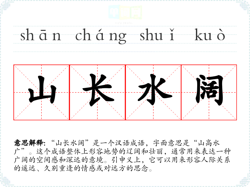 该成语常用于文学作品、诗歌、抒情文章中,也可以在日常对话中使用。例如,在朋友长时间未见后,见面时可以说:“这些年你在外,真是山长水阔,令人牵挂。”在演讲中,提到故乡时也可以使用,来强调与故乡的距离感。