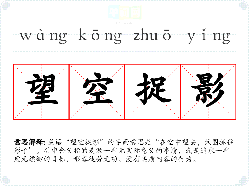 成语“望空捉影”的字面意思是“在空中望去,试图抓住影子”。引申含义指的是做一些无实际意义的事情,或是追求一些虚无缥缈的目标,形容徒劳无功、没有实质内容的行为。