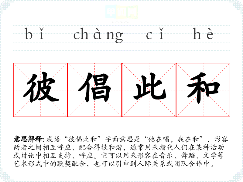 成语“彼倡此和”字面意思是“他在唱,我在和”,形容两者之间相互呼应、配合得很和谐,通常用来指代人们在某种活动或讨论中相互支持、呼应。它可以用来形容在音乐、舞蹈、文学等艺术形式中的默契配合,也可以引申到人际关系或团队合作中。