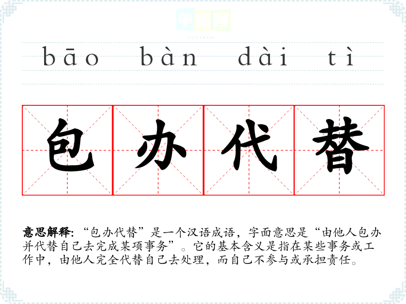 “包办代替”提醒我们在生活和工作中要勇于承担责任,积极参与。它在语言学习和表达中起到警示作用,鼓励我们关注个体的主动性和责任感。在日常生活中,理解和运用这个成语不仅有助于语言能力的提升,也能促进个人成长与人际关系的和谐。