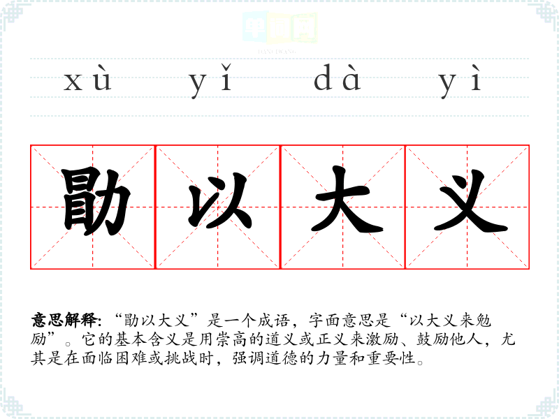 “勖以大义”是一个成语,字面意思是“以大义来勉励”。它的基本含义是用崇高的道义或正义来激励、鼓励他人,尤其是在面临困难或挑战时,强调道德的力量和重要性。