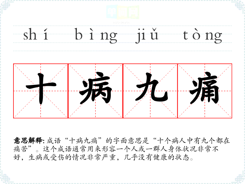 成语“十病九痛”的字面意思是“十个病人中有九个都在痛苦”。这个成语通常用来形容一个人或一群人身体状况非常不好,生病或受伤的情况非常严重,几乎没有健康的状态。