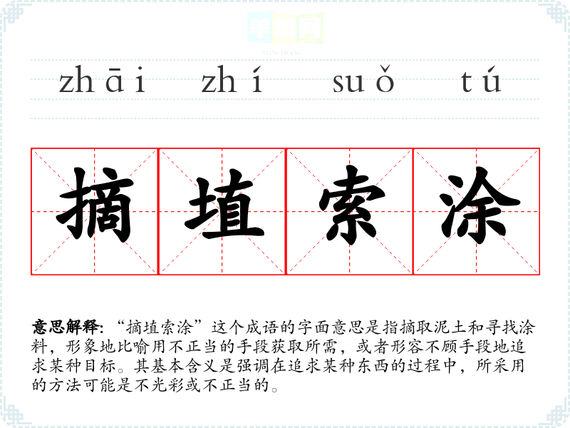 “摘埴索涂”这个成语的字面意思是指摘取泥土和寻找涂料,形象地比喻用不正当的手段获取所需,或者形容不顾手段地追求某种目标。其基本含义是强调在追求某种东西的过程中,所采用的方法可能是不光彩或不正当的。