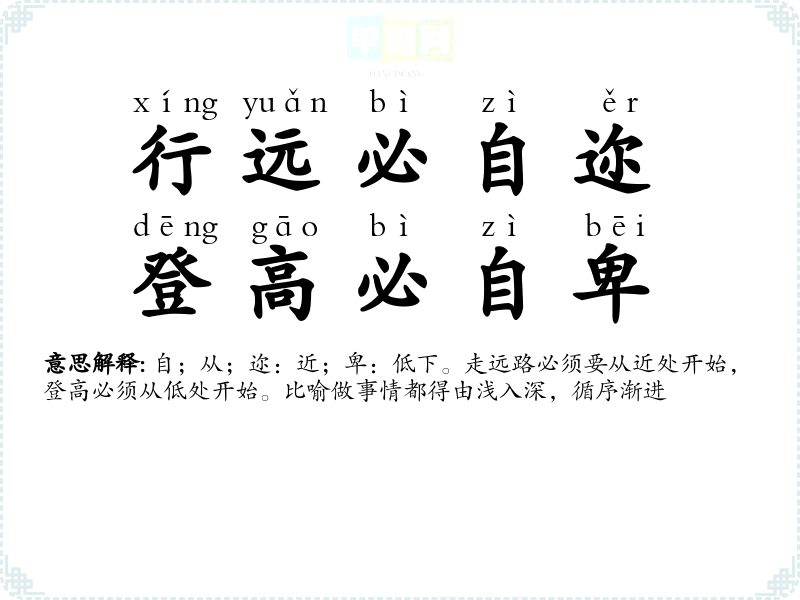 | 行远必自迩,登高必自卑 | 自;从;迩:近;卑:低下。走远路必须要从近处开始,登高必须从低处开始。比喻做事情都得由浅入深,循序渐进 |