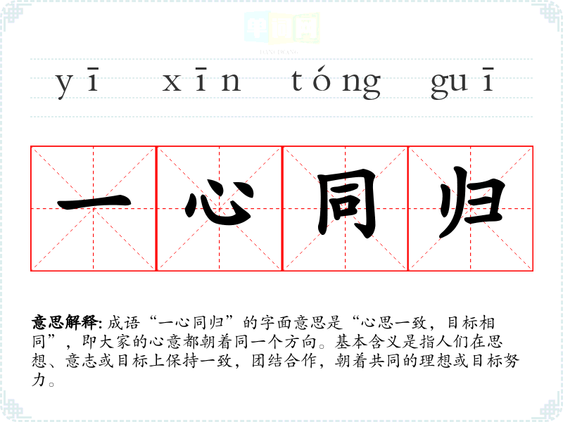 成语“一心同归”的字面意思是“心思一致,目标相同”,即大家的心意都朝着同一个方向。基本含义是指人们在思想、意志或目标上保持一致,团结合作,朝着共同的理想或目标努力。