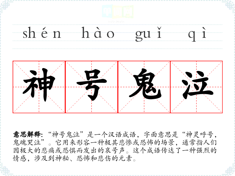 “神号鬼泣”是一个汉语成语,字面意思是“神灵呼号,鬼魂哭泣”。它用来形容一种极其悲惨或恐怖的场景,通常指人们因极大的悲痛或恐惧而发出的哀号声。这个成语传达了一种强烈的情感,涉及到神秘、恐怖和悲伤的元素。