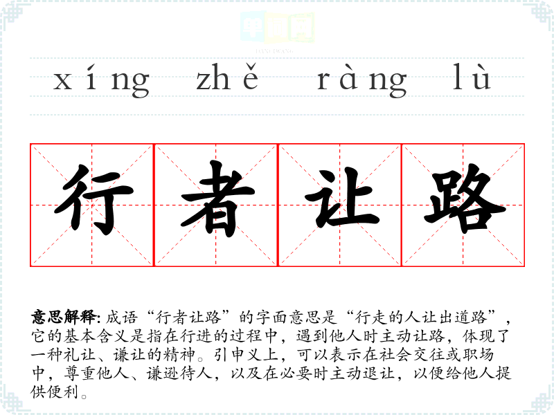 成语“行者让路”的字面意思是“行走的人让出道路”,它的基本含义是指在行进的过程中,遇到他人时主动让路,体现了一种礼让、谦让的精神。引申义上,可以表示在社会交往或职场中,尊重他人、谦逊待人,以及在必要时主动退让,以便给他人提供便利。