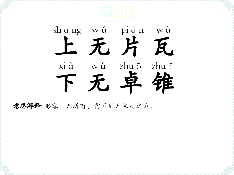 | 上无片瓦,下无卓锥之地 | 卓:直立。形容一无所有,贫困到了极点。 |