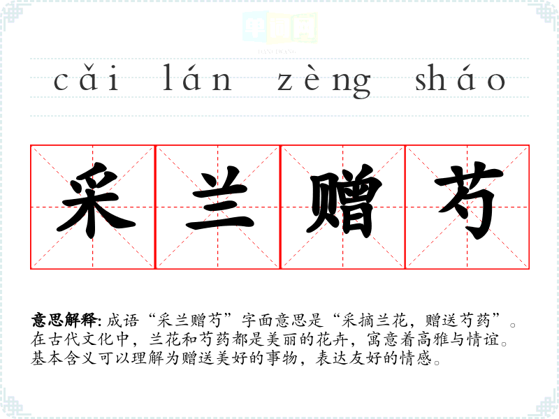成语“采兰赠芍”字面意思是“采摘兰花,赠送芍药”。在古代文化中,兰花和芍药都是美丽的花卉,寓意着高雅与情谊。基本含义可以理解为赠送美好的事物,表达友好的情感。