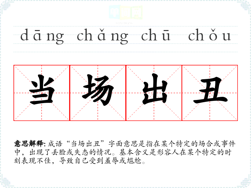 | 当场出丑 | 在大庭广众露出丑相,丢脸。 |