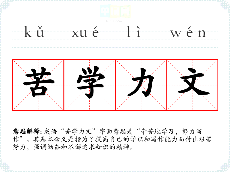 “苦学力文”并没有明确的历史典故或文献出处,但可以从其字面构成和文化背景理解其意涵。在*传统文化中,学被视为一种重要的责任与追求,而“苦学”则强调了学*过程中所需的毅力和辛苦。这一成语反映了古代士人对学问的渴望和执着,以及对文化、文学的重视。