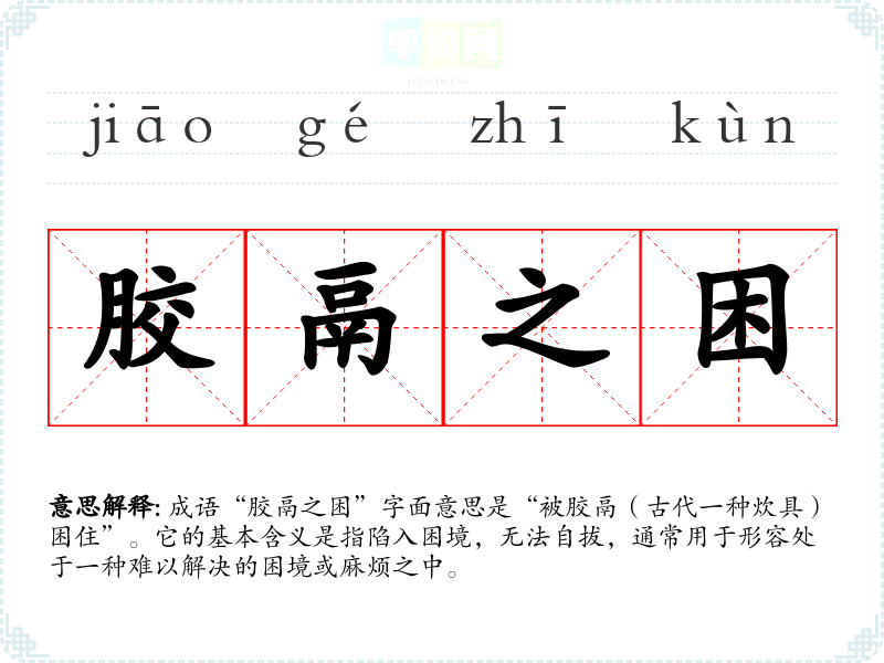 成语“胶鬲之困”字面意思是“被胶鬲(古代一种炊具)困住”。它的基本含义是指陷入困境,无法自拔,通常用于形容处于一种难以解决的困境或麻烦之中。