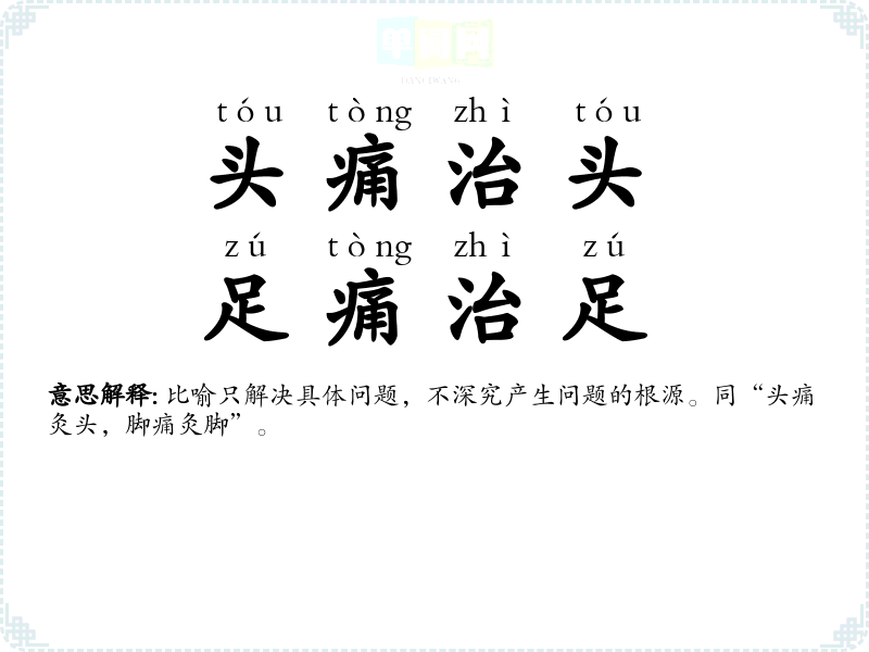 | 不痛不痒 | 既不是痛,也不是痒。原形容说不出的一种难受。现多比喻不触及实质,不切中要害,不解决问题。 |