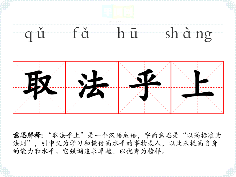 “取法乎上”是一个汉语成语,字面意思是“以高标准为法则”,引申义为学*和模仿高水平的事物或人,以此来提高自身的能力和水平。它强调追求卓越、以优秀为榜样。
