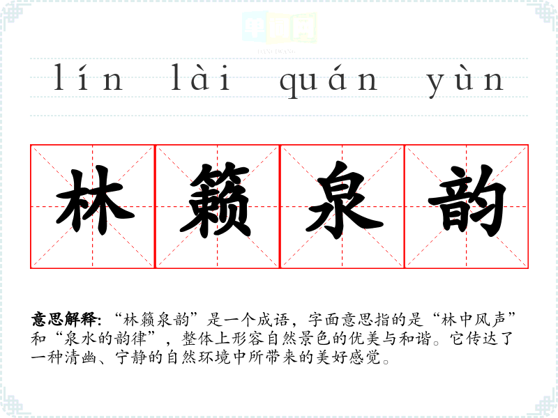 “林籁泉韵”是一个成语,字面意思指的是“林中风声”和“泉水的韵律”,整体上形容自然景色的优美与和谐。它传达了一种清幽、宁静的自然环境中所带来的美好感觉。