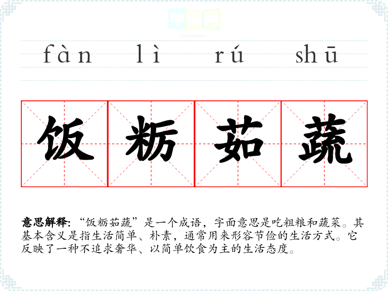 “饭粝茹蔬”是一个成语,字面意思是吃粗粮和蔬菜。其基本含义是指生活简单、朴素,通常用来形容节俭的生活方式。它反映了一种不追求奢华、以简单饮食为主的生活态度。