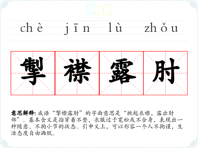 成语“掣襟露肘”的字面意思是“掀起衣襟,露出肘部”。基本含义是指穿着不整,衣服过于宽松或不合身,表现出一种随意、不拘小节的状态。引申义上,可以形容一个人不拘谨,生活态度自由洒脱。