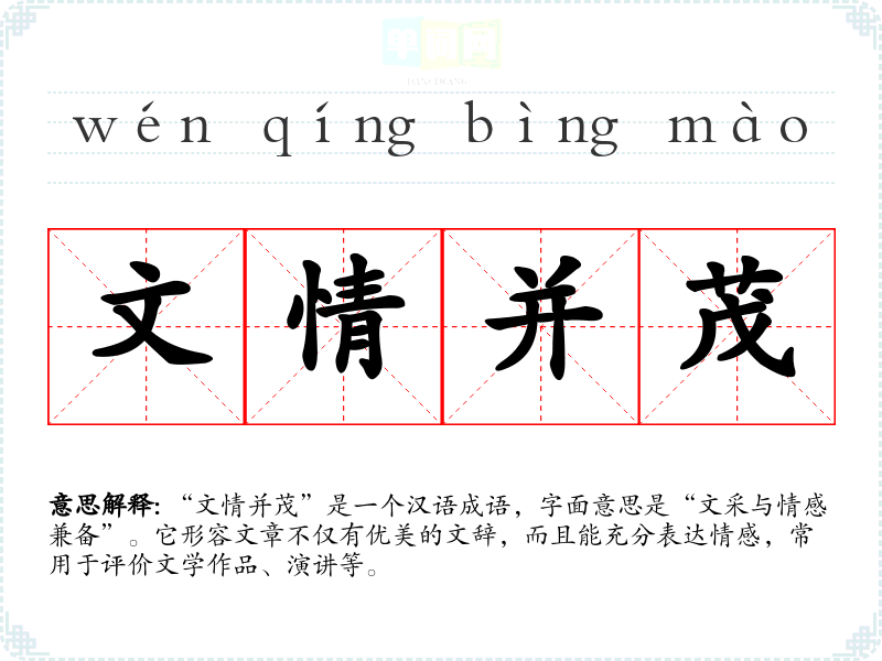 “文情并茂”是一个汉语成语,字面意思是“文采与情感兼备”。它形容文章不仅有优美的文辞,而且能充分表达情感,常用于评价文学作品、演讲等。