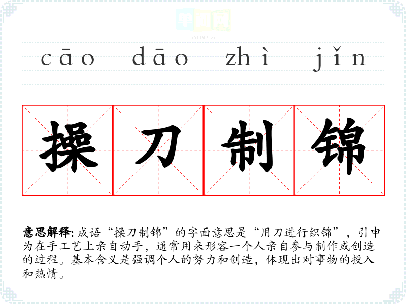 成语“操刀制锦”的字面意思是“用刀进行织锦”,引申为在手工艺上亲自动手,通常用来形容一个人亲自参与制作或创造的过程。基本含义是强调个人的努力和创造,体现出对事物的投入和热情。
