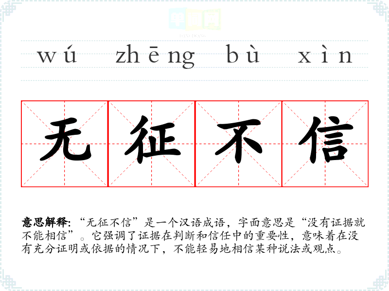 “无征不信”是一个汉语成语,字面意思是“没有证据就不能相信”。它强调了证据在判断和信任中的重要性,意味着在没有充分证明或依据的情况下,不能轻易地相信某种说法或观点。